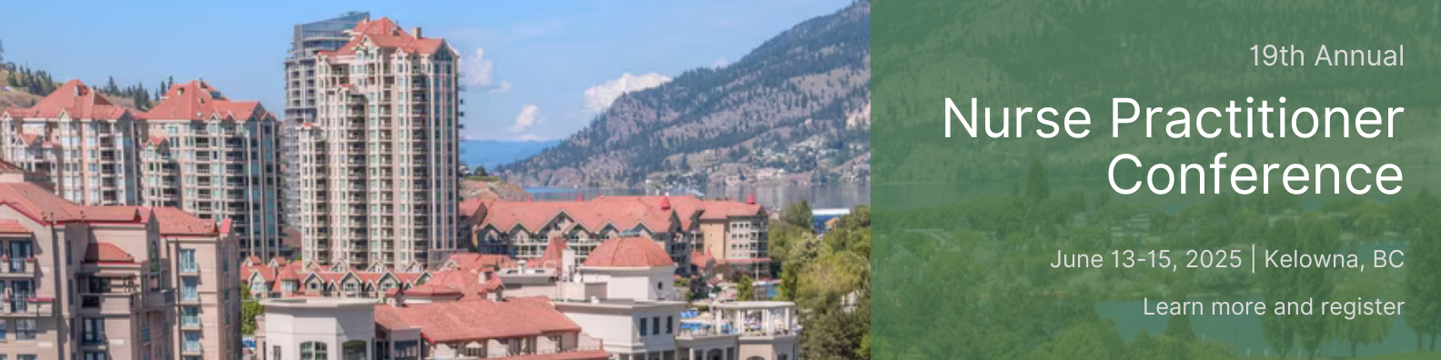 We look forward to welcoming you June 13-15, 2025, for the 19th Annual NP Conference to be held at the Delta Hotels Grand Okanagan Resort, Kelowna, BC. The theme for 2025 is Advancing Clinical Excellence Through Collaboration: NPs Shaping Patient-Centered Care Outcomes. This theme will explore how NPs utilize advanced clinical skills, diagnostics, research, and treatment protocols to elevate patient outcomes, while fostering teamwork and compassionate care across healthcare settings.