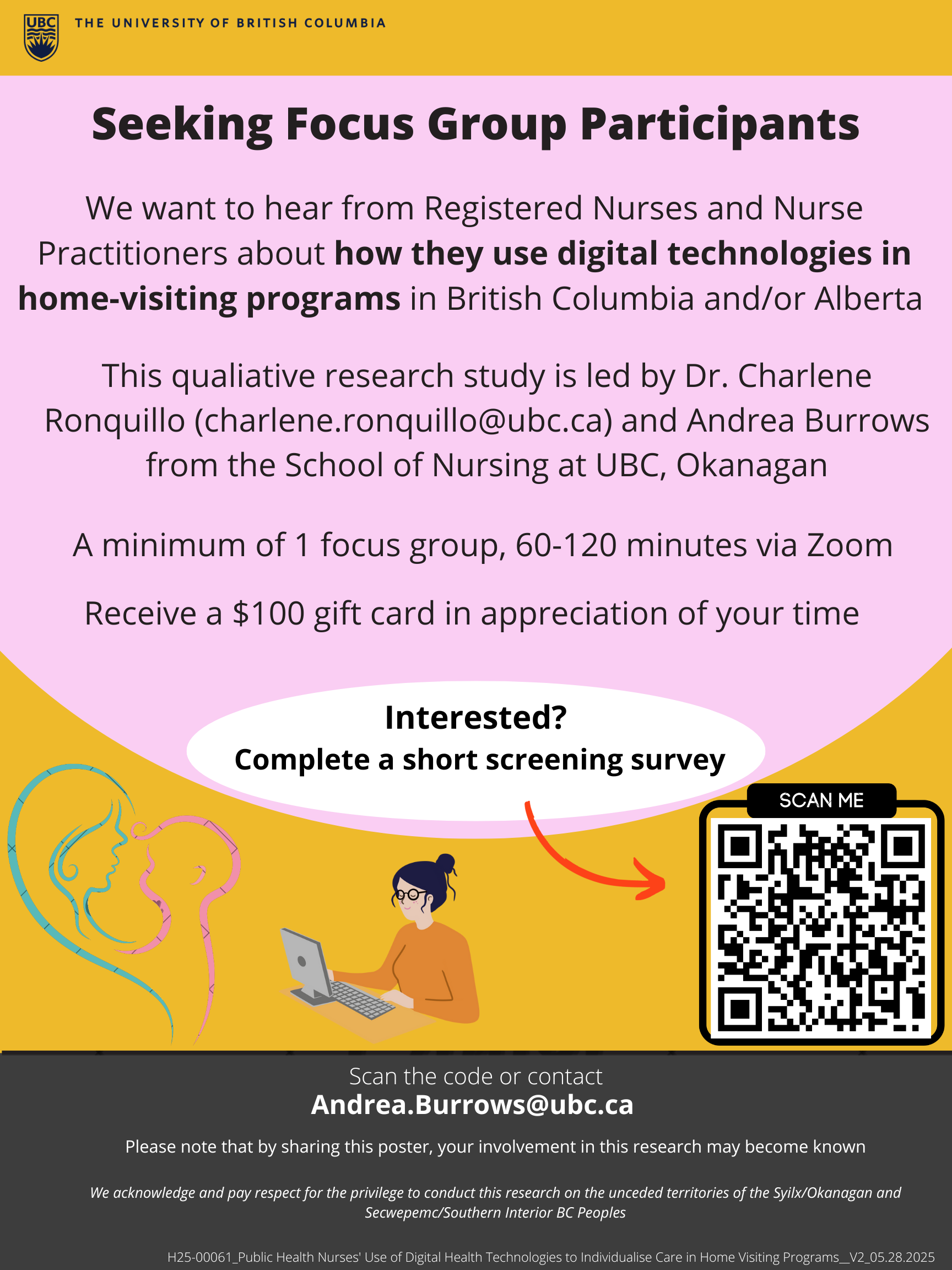| July 9, 2025 | - | Dr. Charlene Ronquillo, Assistant Professor at School of Nursing, UBC-Okanagan | Public Health Nurses’ Use of Digital Technologies to Provide Individualised Care in Home Visiting ProgramsWe invite all Registered Nurses and NPs with experience working in Early Years’ home visiting programs in BC and/or Alberta to participate, aiming to recruit 25-30 nurses for focus groups. This research is funded by the Public Scholars Initiative and has been reviewed by the Behavioural Research Ethics Board of the UBCO. The results of the study will be used to better understand how technologies supplement in-person home visits and provide recommendations about enhancing program delivery and planning. |